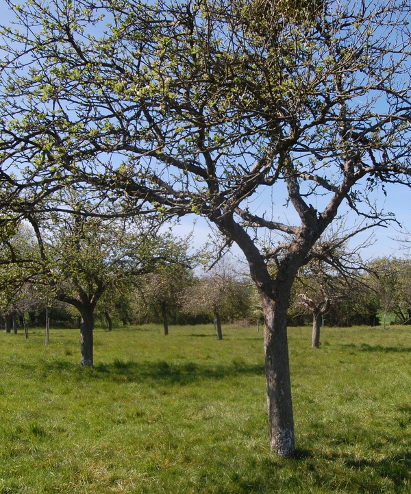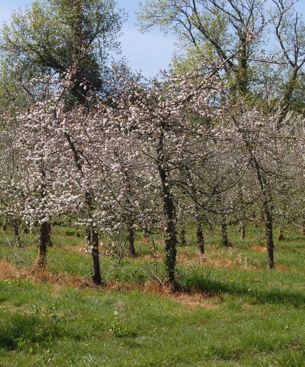 the more modern form of the specialized orchard devoted exclusively to fruit production (orchard low stem). The maintenance of the grass is no longer done thanks to the animal, but mechanically: the grass is regularly ground to form a grass that cushions the fall of the apples. A higher planting density of 1000 trees per hectare for an average yield of 35 tons of cider apples.